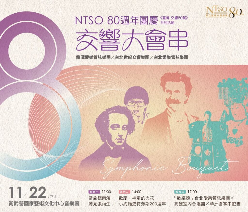 【記者蔡富丞/綜合報導】NTSO國立臺灣交響樂團將於於2025年 11 月 21 日至 22 日在衛武營國家藝術文化中心推出80週年系列活動,一連兩天由音樂廳延伸至戶外劇場,共帶來5場正式音樂會及1場校園團隊演出。節目包含《水藍,陳毓襄與國臺交》、3場《交響大會串》、《我的音樂伸展台》,以及壓軸戶外節目《NTSO交響派對—重返經典》,呈現跨場域、跨世代、跨樂種的多層次藝術風景,邀請民眾以各種方式走進音樂,與國臺交一同慶祝 80 週年。
