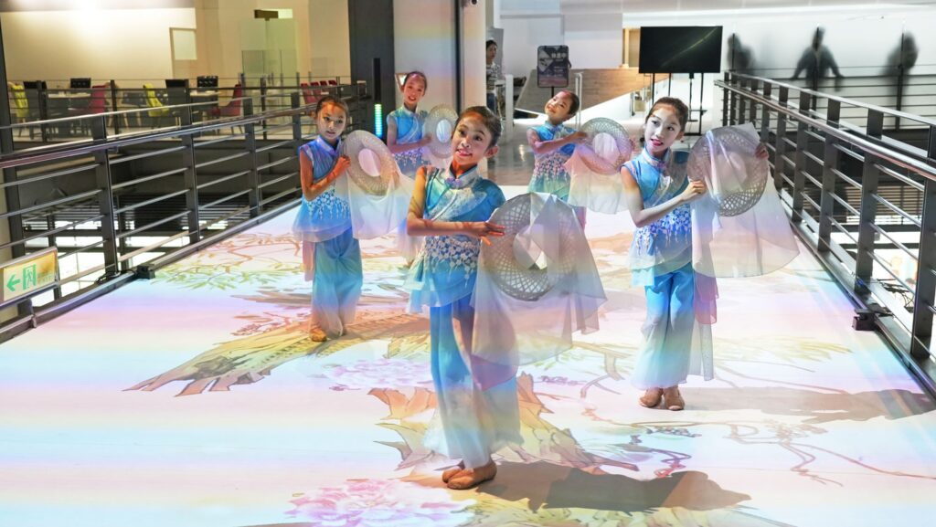當觀眾走入指定區域,即可觸發地面動畫效果,如花朵綻放、枝葉搖曳與雉雞掠影,營造宛如漫步畫中的沉浸氛圍。