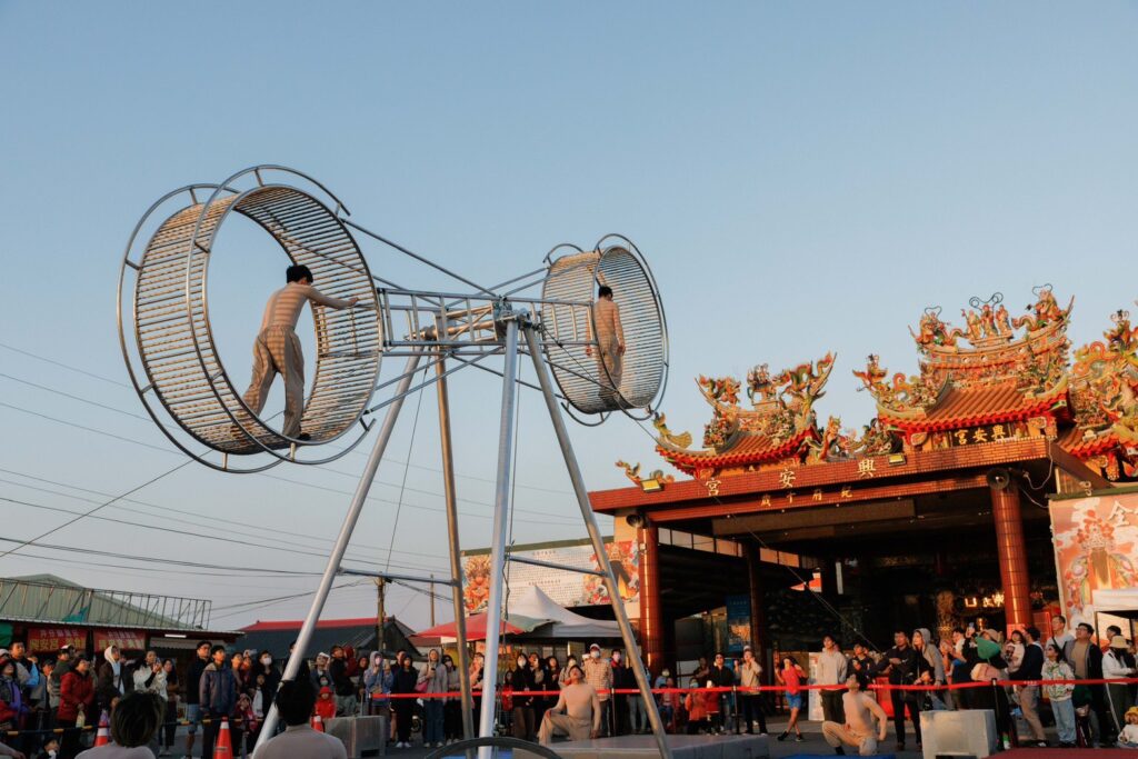 本次「神廟大馬戲」突破傳統舞台框架,將大型特技裝置移至宮廟廣場,演出團隊在高空巨輪上進行高速移動、平衡與翻轉動作,並藉由跑酷流動身法與高空走繩技巧,展現極高技術門檻與演出張力,搭配旁邊鹽田美景,讓觀眾近距離感受馬戲藝術的驚險與美感,也為北門廟埕地景注入全新藝術能量。同時,現場還有精彩魔術表演互動,讓父母小孩歡笑連連。
