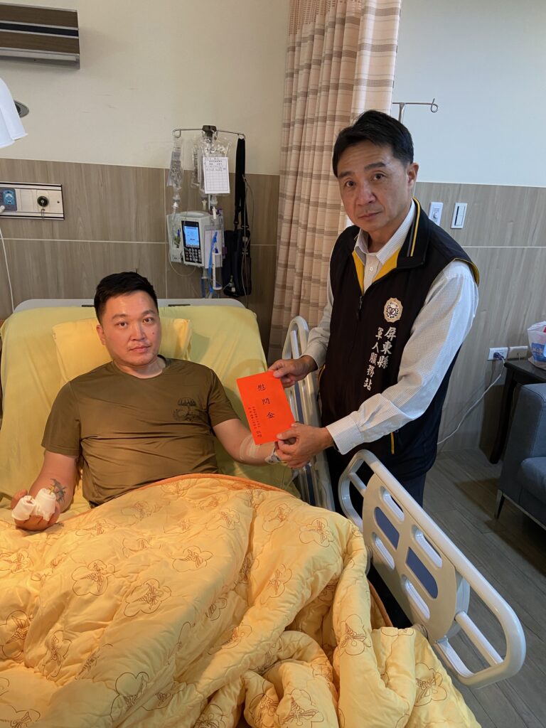 陸軍七五群陳姓上士,因執行公務受傷於國軍高雄總醫院住院治療,屏東縣軍人服務站顧問小博士文教機構董事長廖勝冠今(2)日委請屏東站專員蔡尚武親赴醫院慰問陳上士並祝福早日康復。 屏東軍友站表示,陳上士因公造成身體受傷,經單位幹部聯繫申請,該站隨即協請廖董事長辦理相關慰助事宜,希望透過即時的服務,讓官兵感受到部隊及軍人之友社的溫馨關懷。