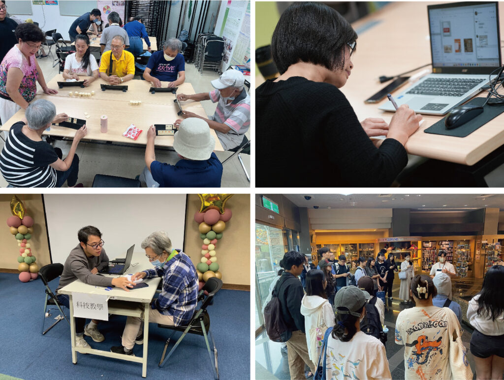 圖說:東吳大學展出USR年度成果,包括獲教育部第四期USR實踐計畫補助的「韌齡心北投生活圈」(左上)、「AI家和」(右上)、「宅家科技健腦趣」(左下)及「士林區族群文化」(右下)計畫。