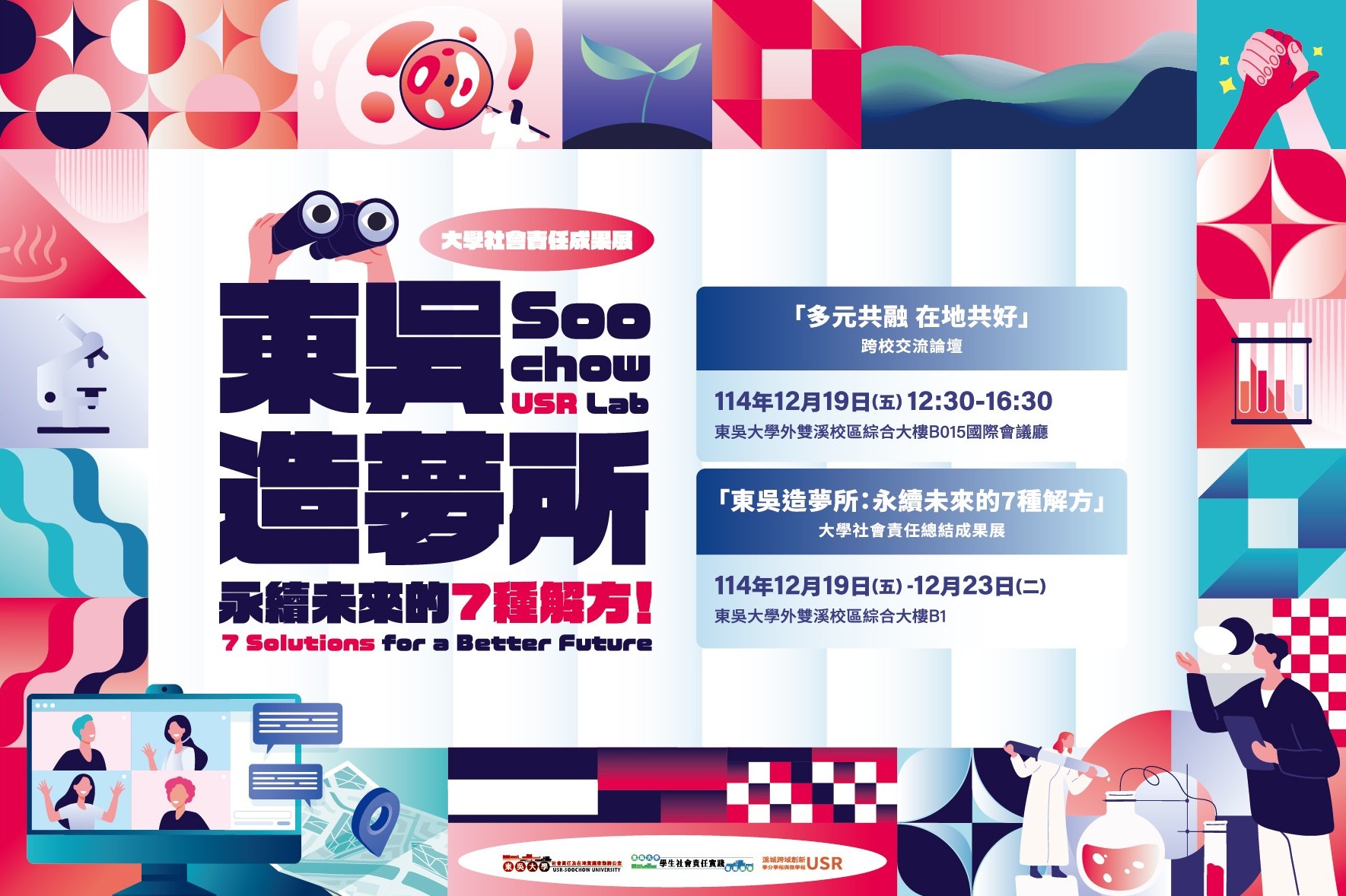 「東吳造夢所:永續未來的7種解方」大學社會責任總結成果展,展出期間114年12月19日(星期五)至12月23日(星期二),地點在東吳大學外雙溪校區綜合大樓B1,誠摯邀請社會各界及產官學夥伴蒞臨參觀,共同見證東吳師生攜手在地夥伴,為「永續未來的7種解方」付出的努力與創新。