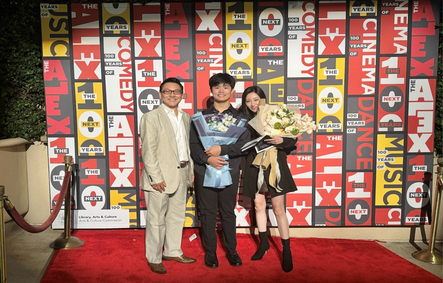 圖▲林采瑩(右)與青年鋼琴家雷(中)於美國加州知名的百年劇院Alex Theatre演出後合影。(圖/林采瑩提供)