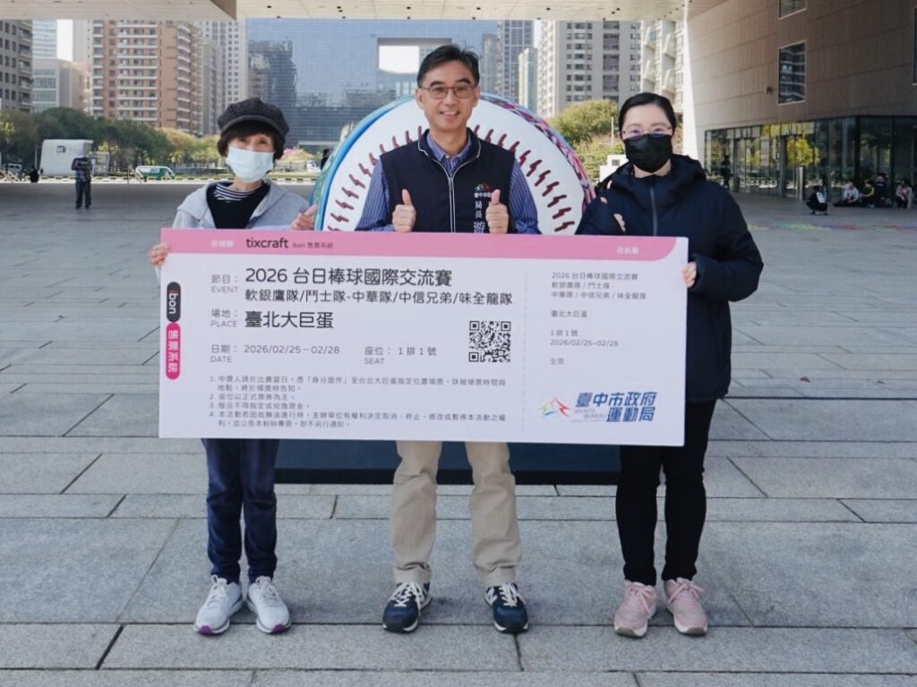 【民眾網諸葛志一臺中報導】2026世界棒球經典賽(World Baseball Classic)開賽倒數不到一個月,臺中市政府提前點燃棒球熱潮,推出市府前廣場賽事直播「週週抽好禮」活動,首波幸運得主 11日出爐,獲得「2026台日棒球國際交流賽」門票。運動局長游志祥在市府前廣場巨型棒球藝術前,親自頒獎兩位幸運得主,並邀請全國球迷於賽事期間,相約府前廣場看直播,一起成為中華隊最強後盾。