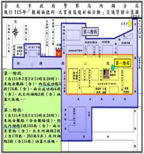 內湖分局為維持現場及周邊秩序與安全,是日15時至24時將進行2階段交通管制範圍,管制情形詳如示意圖: