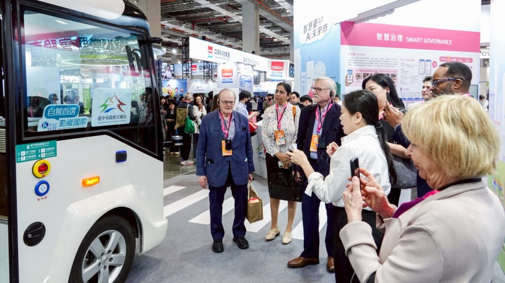 《圖說》ICF會長率團參觀台中自駕巴士等智慧解決方案。