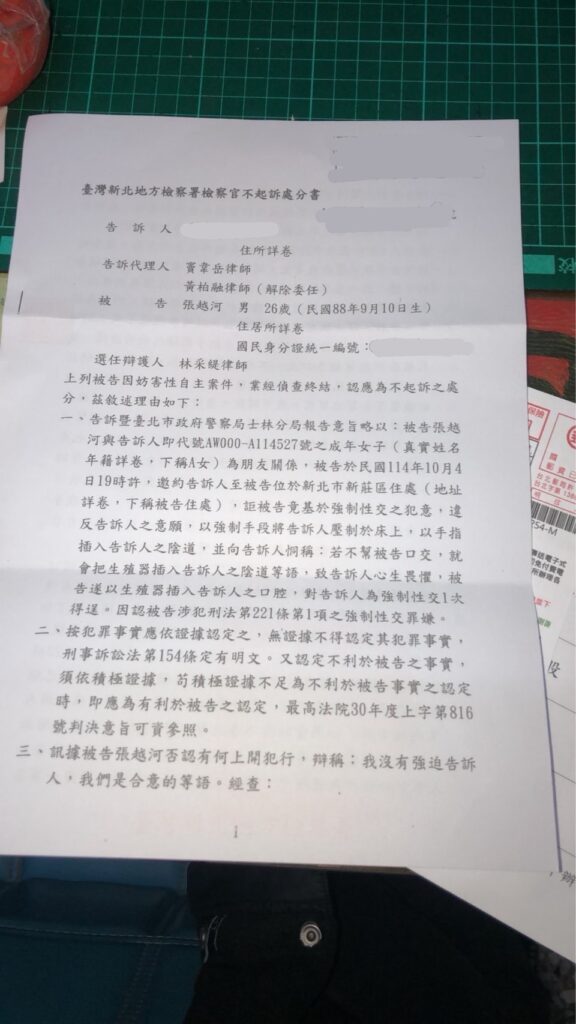 不少網友在留言區敲碗不起訴處分書的全文,本報也獨家向張越河本人取得授權如下:
