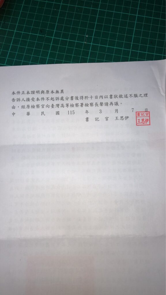 關於此案,經司法機關審慎調查後—— 「檢方已作出不起訴處分。」 感謝司法單位還原事實、釐清真相。