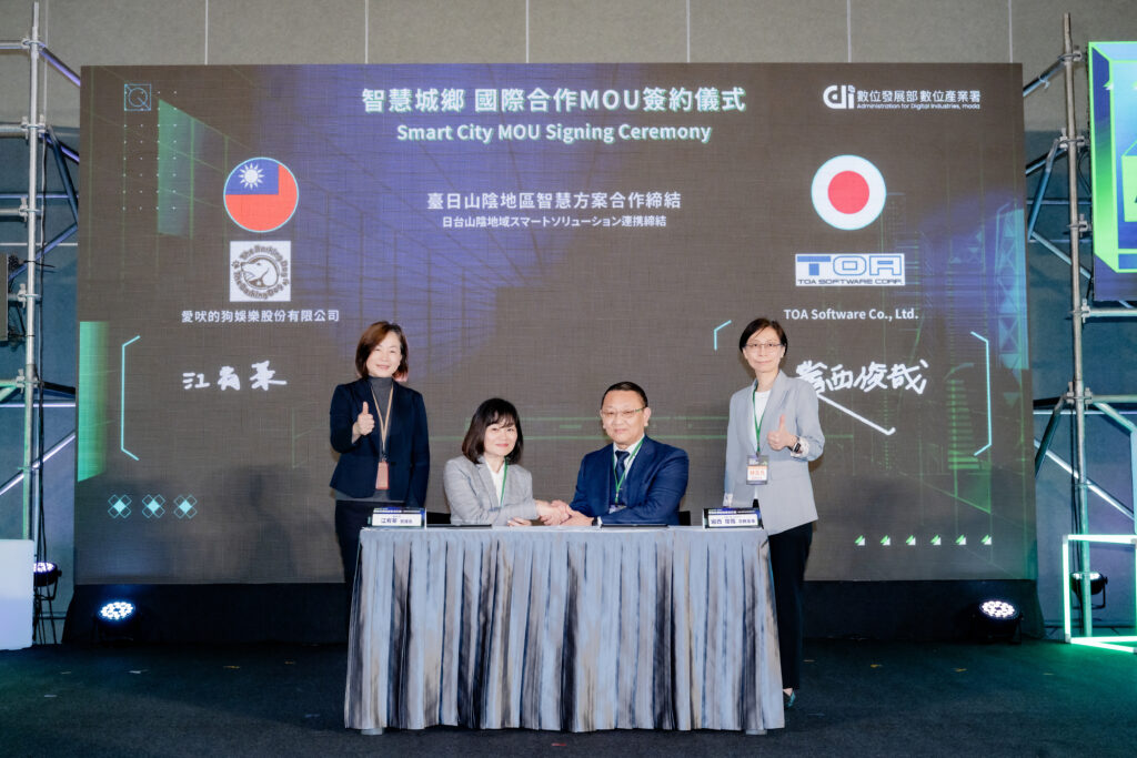 【記者羅伯特/綜合報導】數位發展部數位產業署今(19)日於南港展覽館二館舉辦「2026智慧城鄉創新匯流沙龍暨創業歸故里授證典禮」,匯聚智慧城鄉服務業者及40家「創業歸故里」的獲獎團隊,共同分享智慧科技於地方場域的應用成果。現場更傳來兩項跨國合作捷報,首先,在數產署黃雅萍副署長及比利時駐台代表馬徹(Matthieu Baudouin A. Branders)的見證下,臺灣數位照護業者「先進醫資」與比利時商「Dermatoo」正式簽署合作協議;另在數產署黃雅萍副署長及資策會林玉凡副執行長的見證下,臺灣數位互動科技業者「愛吠的狗娛樂股份有限公司」亦與日商「TOA Software Co., Ltd.(東亞ソフトウェア株式會社)」完成合作簽署,充分展現臺灣智慧城鄉解決方案輸出國際的競爭力。
