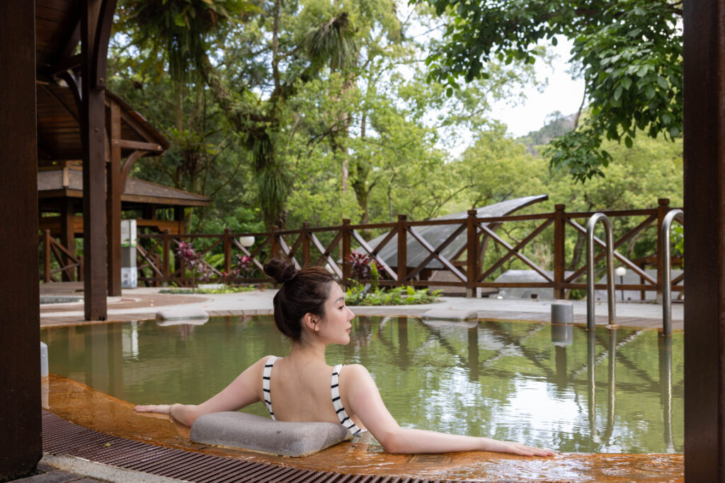 旅人入住天成逸旅-蝴蝶谷可體驗戶外涌泉溫泉風呂,湯泉與水療體驗,自然泉質滑順、泡完後感覺肌膚滋潤,在溫泉及森林中獲得身心療癒。圖/天成逸旅-蝴蝶谷提供