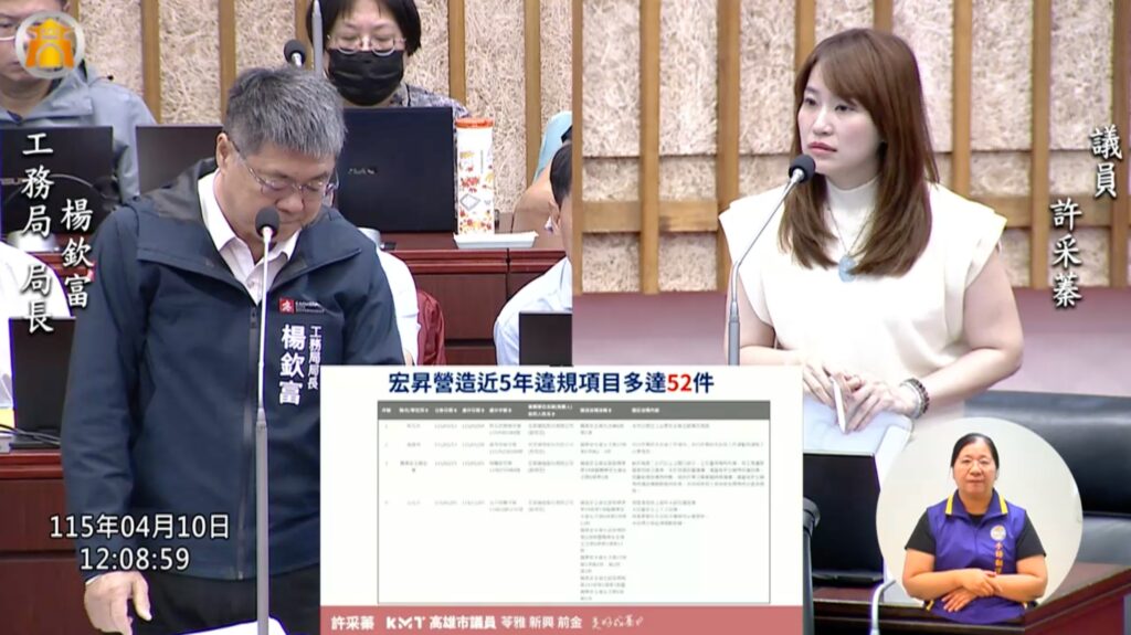 高雄市議員許采蓁在議會質詢中揭露宏昇營造是嚴重的工安累犯,質疑市府裁罰過輕、復工過快。