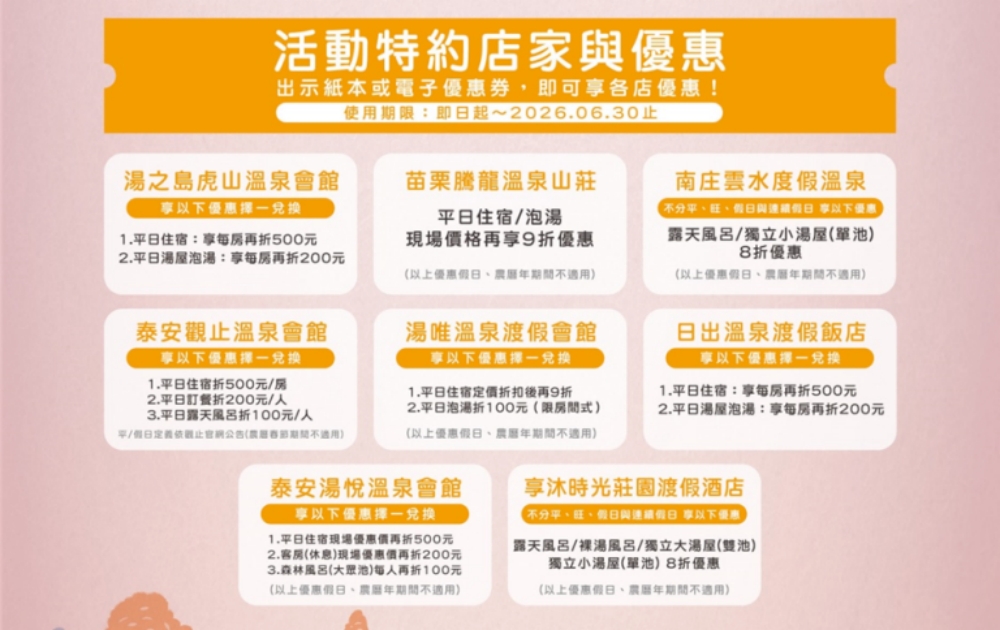 雖然發票抽獎已告一段落,但苗栗的暖意不間斷。主辦單位特別提醒,即日起至 2026 年 6 月 30 日止,民眾只要前往活動特約店家(包括湯之島虎山溫泉會館、苗栗騰龍溫泉山莊、南庄雲水度假溫泉、泰安觀止溫泉會館、湯唯溫泉渡假會館、泰安湯悅溫泉會館、享沐時光莊園渡假酒店、日出溫泉渡假飯店),平日出示紙本或電子折扣優惠券,仍可享有住宿或泡湯的專屬優惠。更多關於苗栗觀光資訊及優惠券下載,請至「泰安旅遊智慧網」官網查詢。