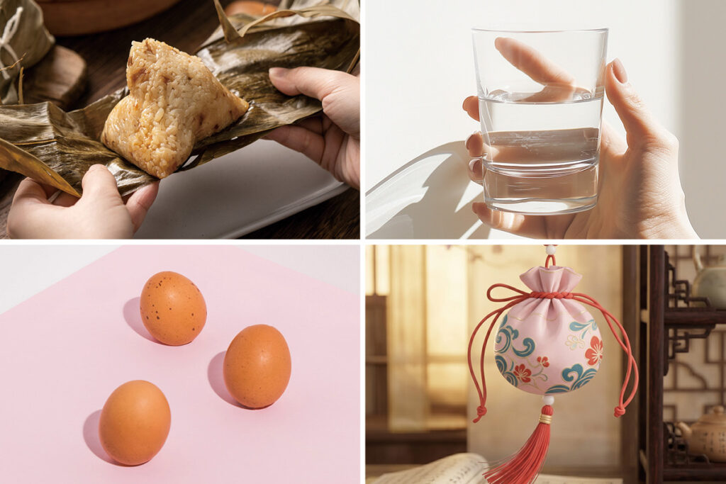 3-飲雄黃酒:過去傳統會喝雄黃酒驅毒、驅蟲,但現代多以飲用香包驅邪、塗抹雄黃於小兒額頭上代之。