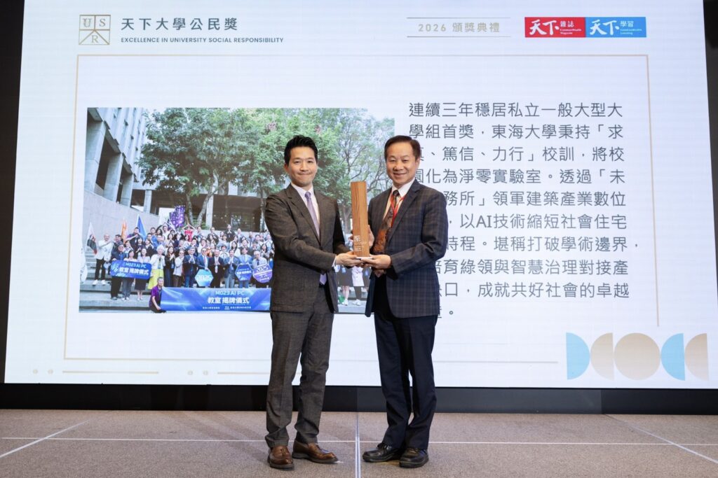 【民眾網諸葛志一臺中報導】2026 年「天下大學公民獎暨校長辦學績效互評調查」,東海大學憑藉深厚的永續底蘊與強大的 AI 創新量能,連續三年蟬聯「天下大學公民獎」私立一般大型大學組榜首。在已連續舉辦十二年的「大學辦學績效互評獎」,於國內110所大專院校校長互評中拿下全國第七名。