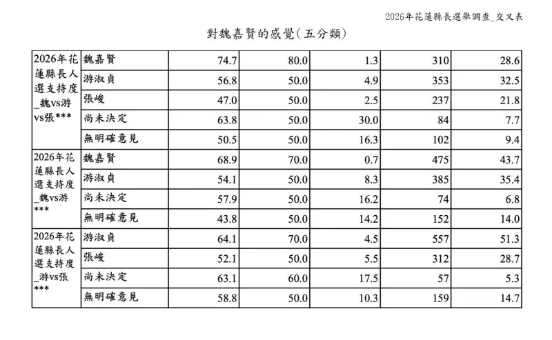 交叉分析顯示,魏嘉賢在年輕族群與高教育程度選民中具備絕對優勢。在20至39歲的支持度甚至突破六成,大學以上學歷選民亦呈現明顯領先。地方政治人士觀察,魏嘉賢曾任三屆縣議員及兩屆花蓮市長,行政與民代資歷完整,且長期深耕北花蓮基層,其務實的政策取向與科學數據導向的問政風格,是吸引年輕族群的主因。
