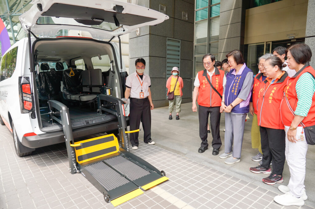 板橋義橋宮城隍尊神協會集結善信的愛心昨捐贈一輛雙乘座位的復康巴士予新北市府,幫助身障朋友安心出行。 (新北社會局提供)
