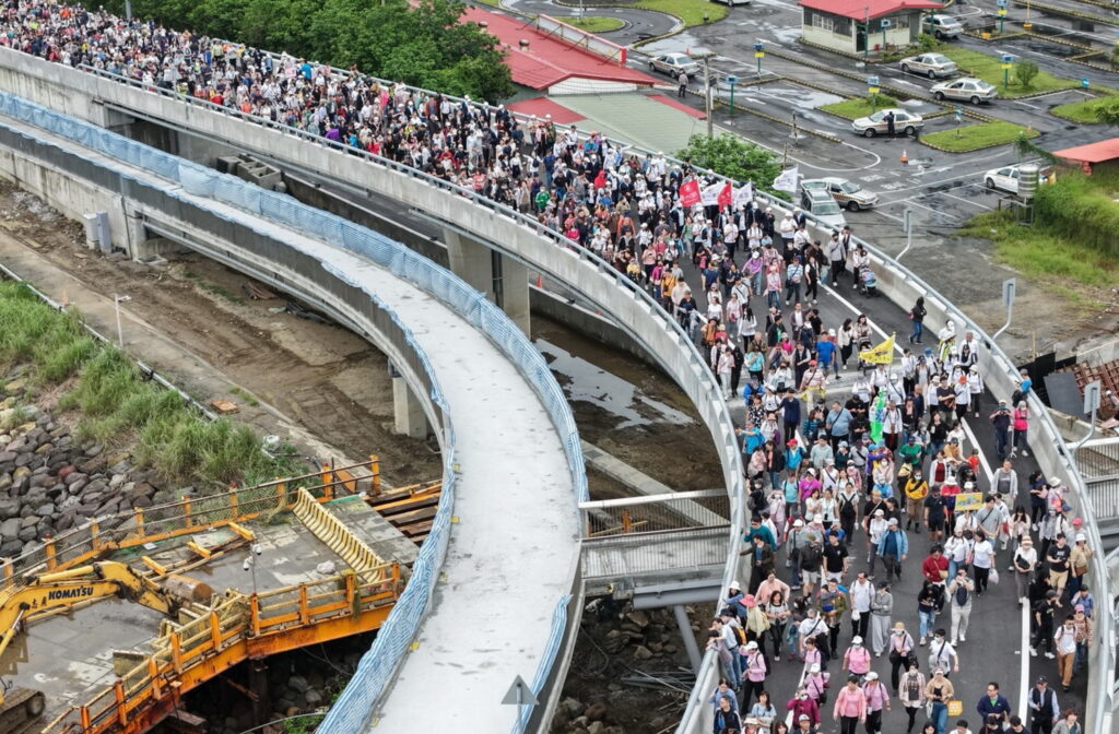 廿五日一早參與民眾陸續湧入淡水漁人碼頭,健走路線全長約二點五公里,許多家庭扶老攜幼參與,上萬民眾登上主橋後隊伍綿延成壯麗人龍,在折返點可三六0度飽覽淡水河口與八里海岸線的絕美景致;沿途設置的拍照打卡板與補給站被擠得水洩不通,用鏡頭捕捉。