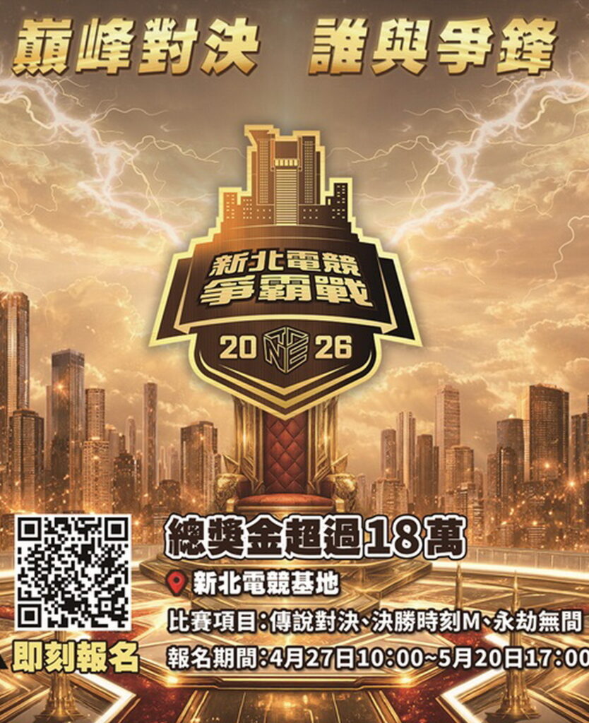 新北市府經發局年度指標性賽事「二0二六新北電競爭霸戰」即日起至五月二十日開放報名,總獎金達十八萬元;今年賽事全面升級,除熱門項目《傳說對決》外,亦納入人氣射擊遊戲《決勝時刻M》,新增亞洲運動會電子競技項目《永劫無間》,打造多元競技舞台,讓不同類型玩家皆能一展身手,歡迎全台年滿十五歲以上電競好手踴躍參與。
