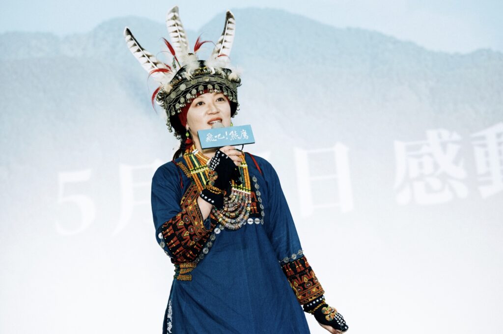 【飛吧熊鷹】活動圖_排灣族泰武鄉部落傳統領袖沈文伶,身穿部落傳統服裝蒞臨首映會分享心得( 采昌國際多媒體 提供 )