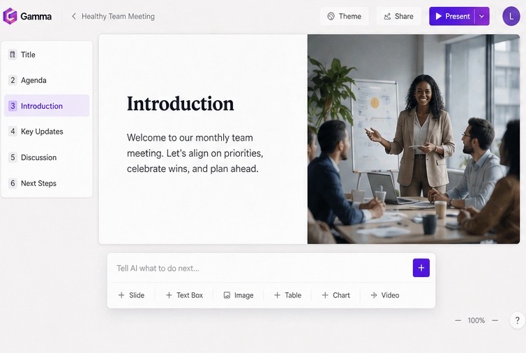 此外,Gamma也持續強化協作功能,使團隊能在同一工作環境中共同編輯、調整與分發內容,更符合企業行銷與商務需求。