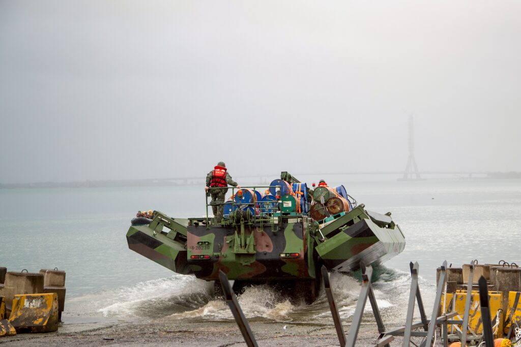 第三作戰區指出,河道阻絕設置以油桶爆破與浮動平臺裝載為主,透過浮門橋車完成阻絕設施吊掛與定位,並由偵察突擊舟負責後續解構與支援任務;演練過程中,岸邊指揮人員與水上作業人員全程保持通聯,掌握阻絕位置與間距,確保阻絕設施設置效果。