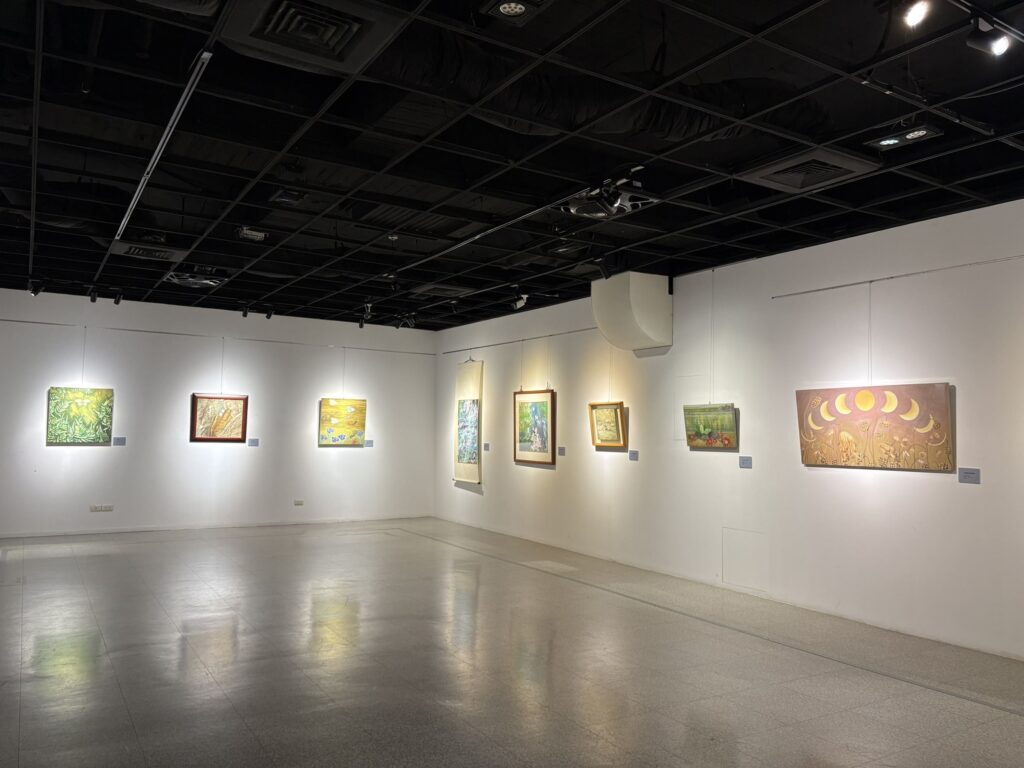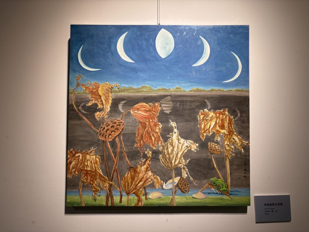 展出作品〈貓的密夜〉、〈秋蓮遙對冷蒼瓊〉、〈蝶逐流〉、〈舞藝情動五月雪〉等作品遊走於物象與心象之間,以形色交織呈現意象的流動;〈夜半凌寒暗沉香〉描繪月夜中盛開的梅花,展現出堅毅的生命力與清雅的氣質;〈國土之殤〉、〈變色國土〉、〈花蓮馬太鞍溪颶風驟雨記痕〉、〈堰塞湖之懼〉等作品紀錄自然災害帶來的衝擊,將環境的變動轉化為深刻的視覺藝術。