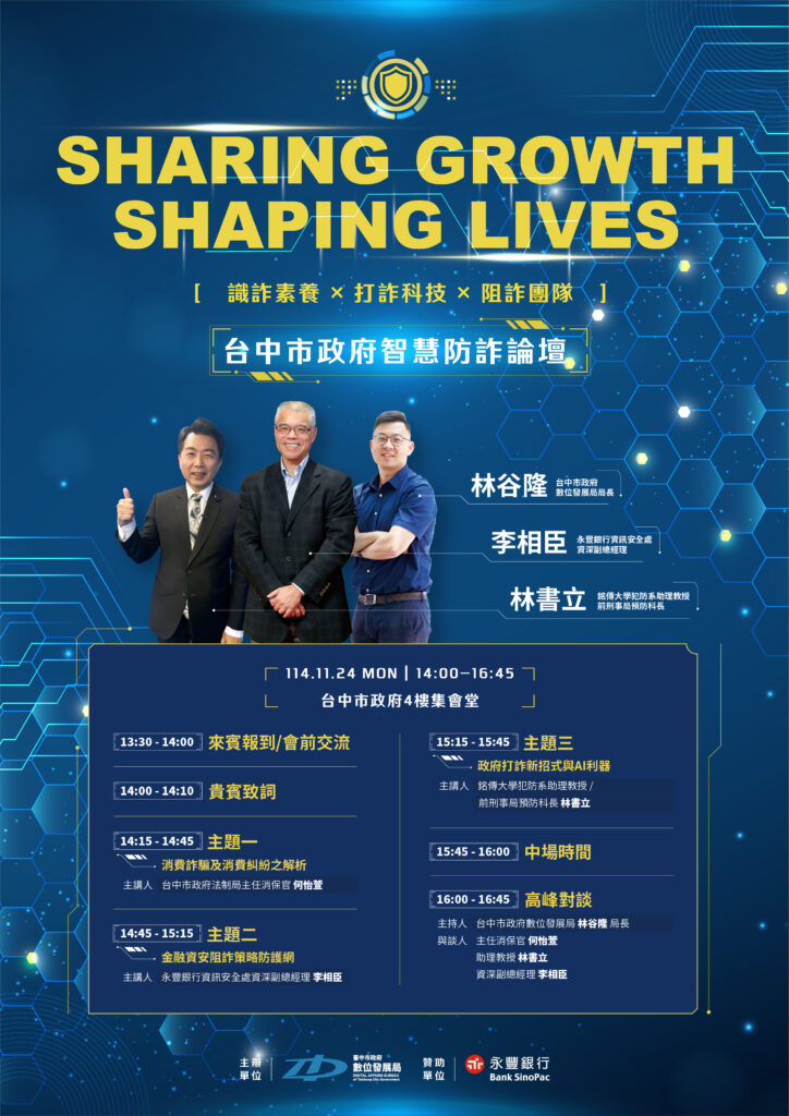 壓軸登場的「台中市政府智慧防詐論壇」則將於11月24日舉行,由數位局與永豐銀行合作。論壇邀請永豐銀行資訊安全處資深副總李相臣、銘傳大學助理教授林書立與市府法制局主任消保官何怡萱等講者,從AI生成詐騙、司法防護與金融資安三大角度剖析當前挑戰。論壇並將分享生成式AI詐騙防禦的新趨勢與跨部門應對策略。活動報名資訊請見網站([https://p.accu.ps/8andrc)。](https://p.accu.ps/8andrc%29。)