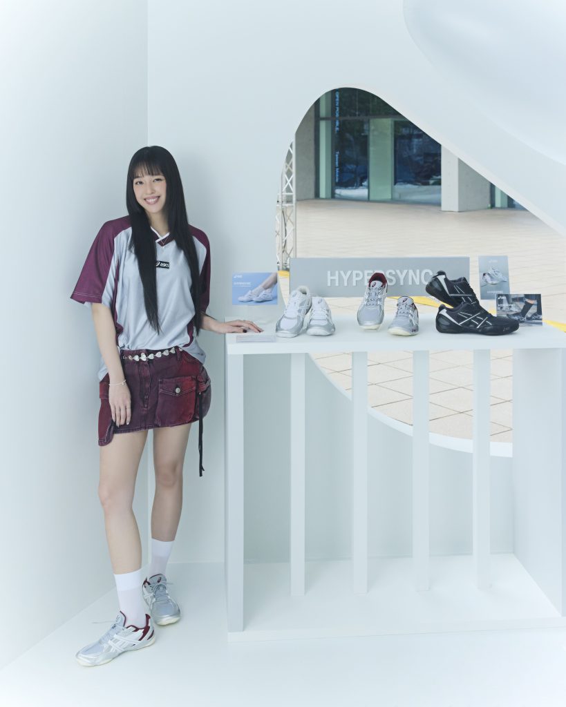 王渝萱以銀紅色系的運動感風寬版上衣搭配HYPERSYNC 鞋款,詮釋 ASICS SPORTSTYLE 的全新造型。(圖/品牌提供)